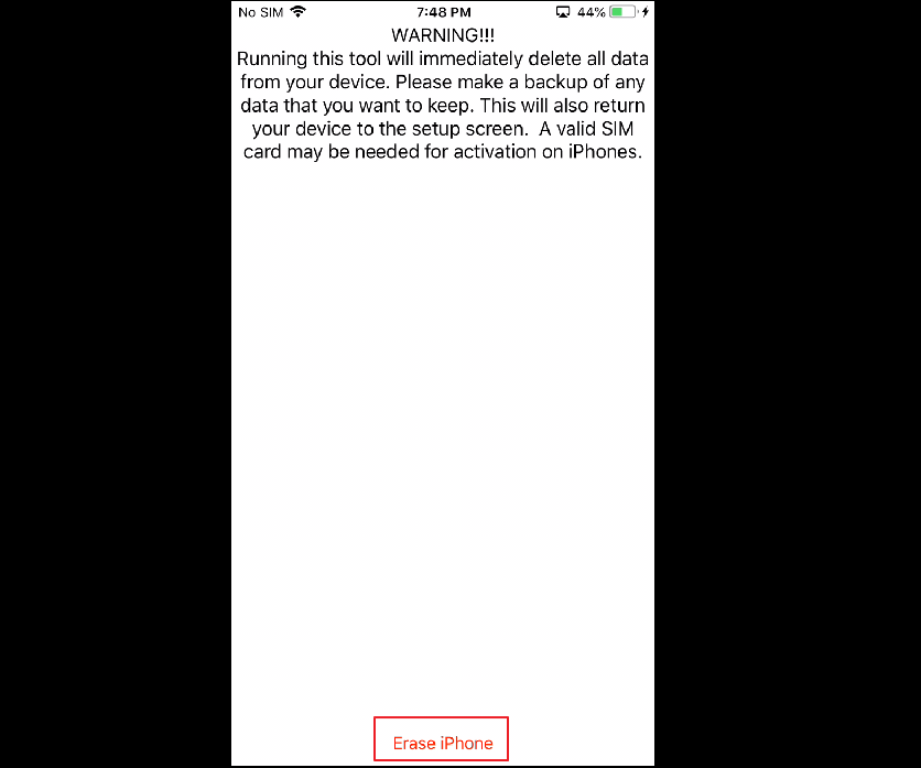 6. 10초 정도 기다리면 다음과 같은 화면이 나타나는데(나타나지 않는 경우 뒤로 갔다가 다시 진입), Erase iPhone을 클릭하면 복구가 시작됩니다.