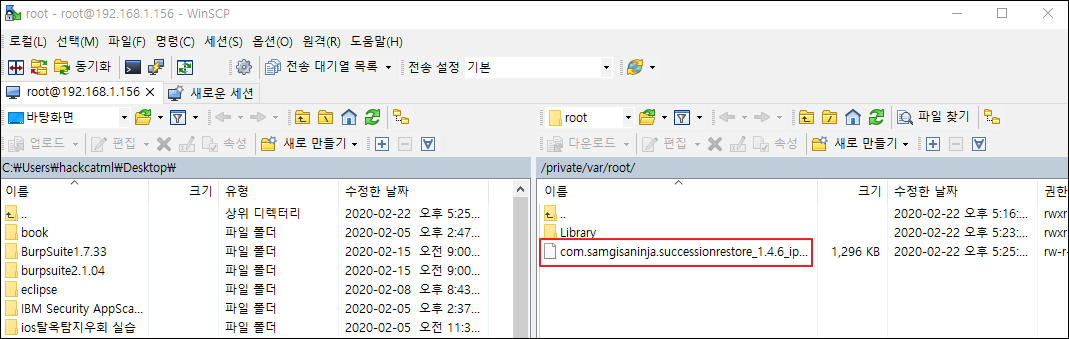탈옥한 아이폰에 winscp를 이용하여 다음 succession설치 파일(1.4.2버전으로 테스트)을 이동시킴(github주소: https://github.com/Samgisaninja/SuccessionRestore/releases)