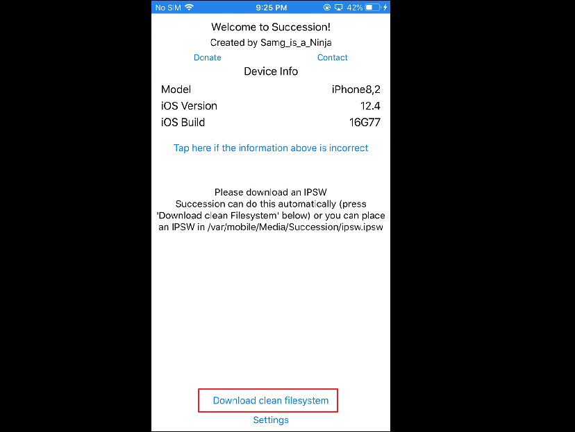 4. Succession앱 실행하여 Download Clean Filesystem 클릭하면 현재 버전에 맞는 순정파일 다운로드가 진행됩니다.
