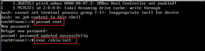 "passwd root" 명령어로 패스워드 재설정 및 "exec /sbin/init" 명령어로 재부팅