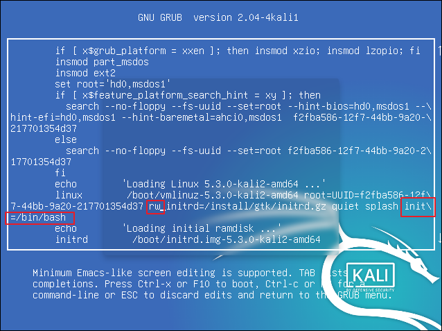 (칼리 2018과 다르게 2019는 init=/bin/bash가 끝 라인에 오지 않으면 부팅이 안됨)
