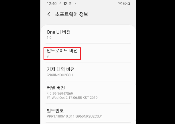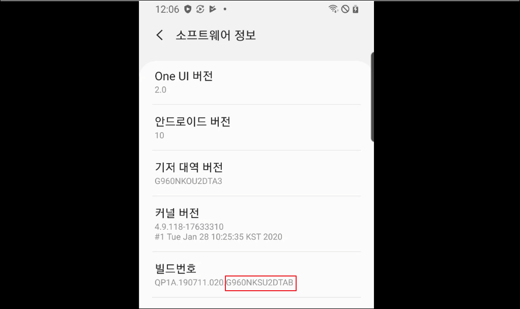 설정 --> 휴대전화 정보 --> 소프트웨어 정보에 들어가면 빌드번호가 보이는데, ~G960NKSU2DTAB 의 빌드번호는 2임