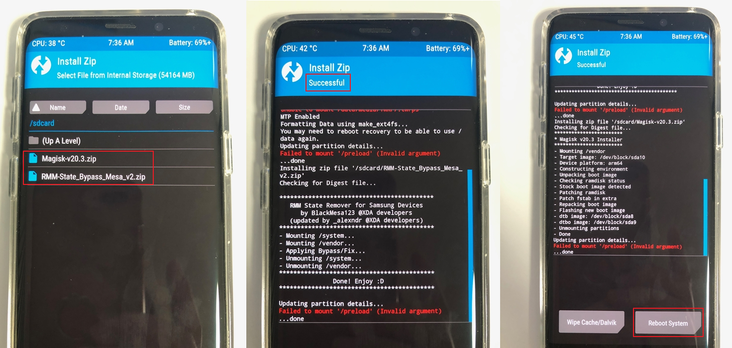 Magisk까지 설치되었다면 Reboot system클릭하여 재부팅 진행