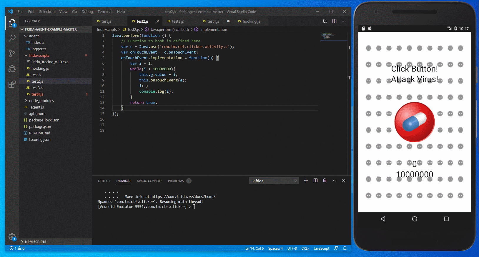 처음에는 단순히 onTouchEvent를 Frida로 후킹하여 1000만번 클릭하게 구성
