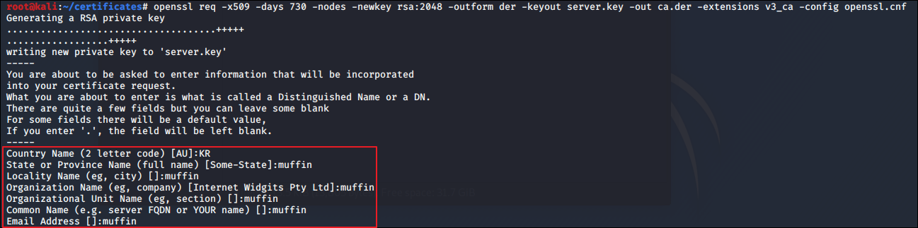 openssl req -x509 -days 730 -nodes -newkey rsa:2048 -outform der -keyout server.key -out ca.der -extensions v3_ca -config openssl.cnf