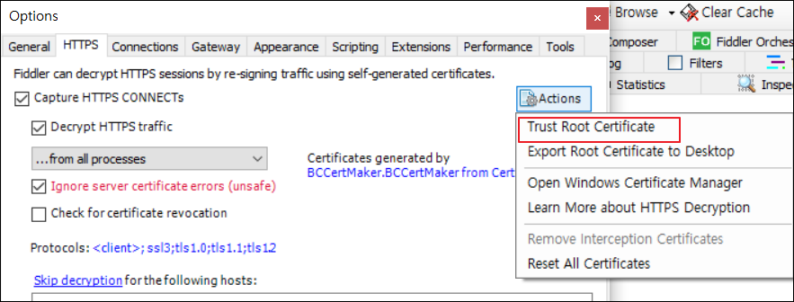 Fiddler 실행 후 Tools --> Options --> HTTPS 탭에서 Actions버튼 클릭해서 PC에 Fiddler 인증서 설치