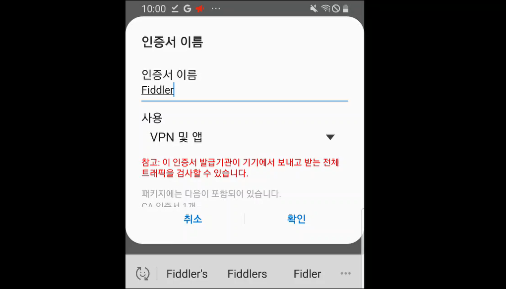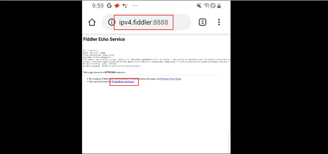 chrome에서 http://ipv4.fiddler:8888 로 접속하여 인증서 다운로드 및 설치(사용자 인증서로 설치됨)
