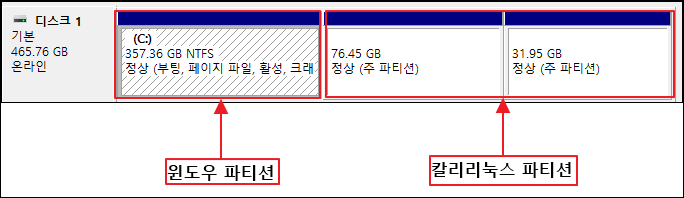 다음과 같이 하드디스크의 파티션을 나누고 빈 파티션에 리눅스 OS 설치