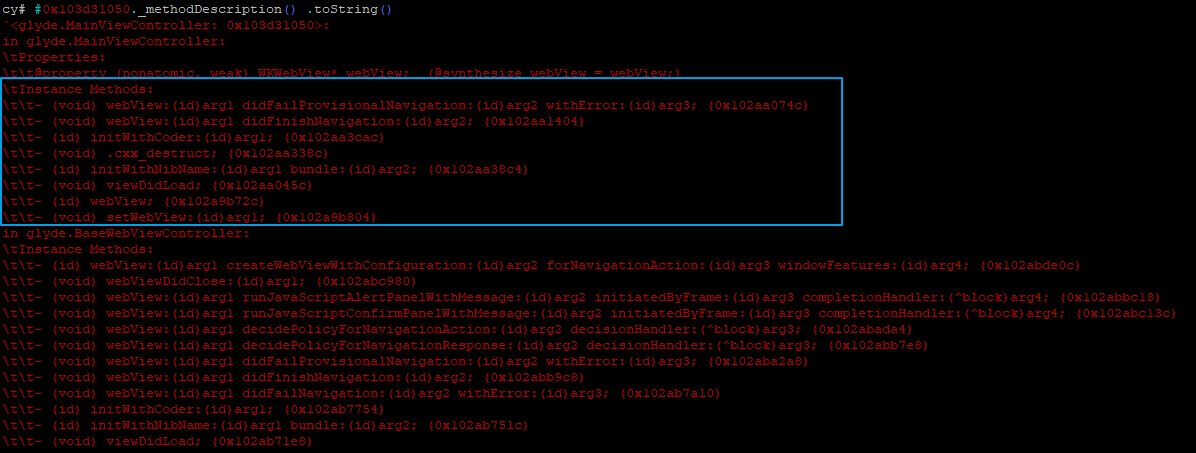 #<주소값>._methodDescription().toString() // 이 방법의 경우 알고자 하는 클래스의 method 뿐만 아니라 다른 클래스의 메서드들도 출력해주다보니 쓸모없는 정보들이 너무 많이 출력됨