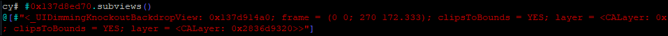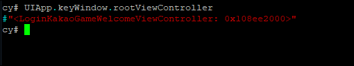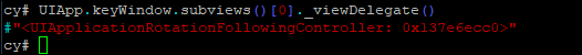 UIApp.keyWindow.subvies()[index]._viewDelegate() // 해당 뷰를 담당하는 controller 출력. 아래 예시는 keyWindow의 첫번째 subview를 담당하는 controller가 UIApplicationRotationFollowingController 임을 나타냄.