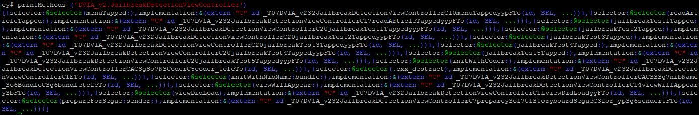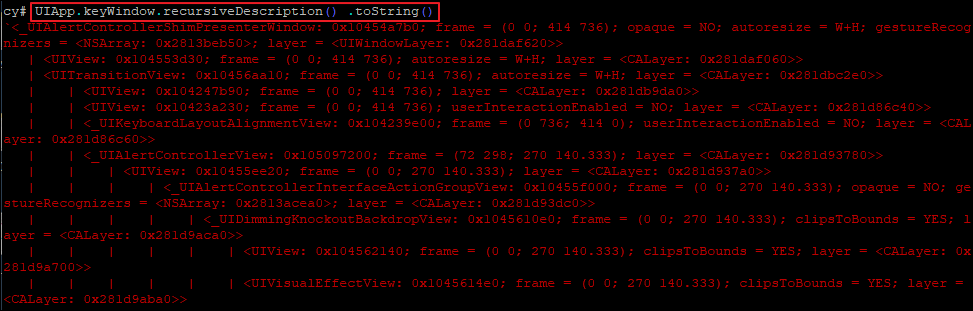 UIApp.keyWindow.rootViewController._printHierachy() 명령어로 뷰 계층 확인 후 관심 클래스의 주소값에 대하여 다음 명령어 수행