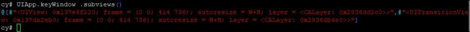 UIApp.keyWindow.subviews() // keyWindow의 subviews 확인. 아래 예시는 #으로 구분되는 2개의 subviews를 가지고 있음