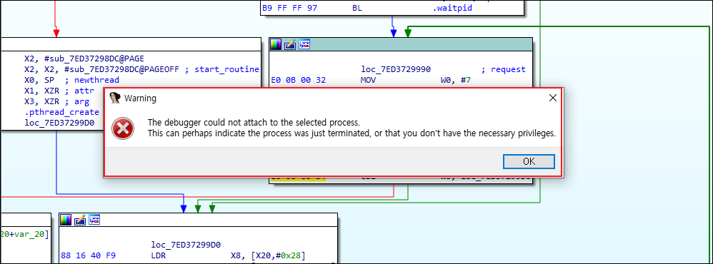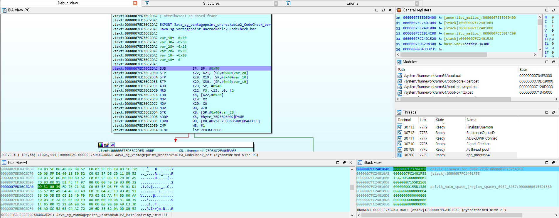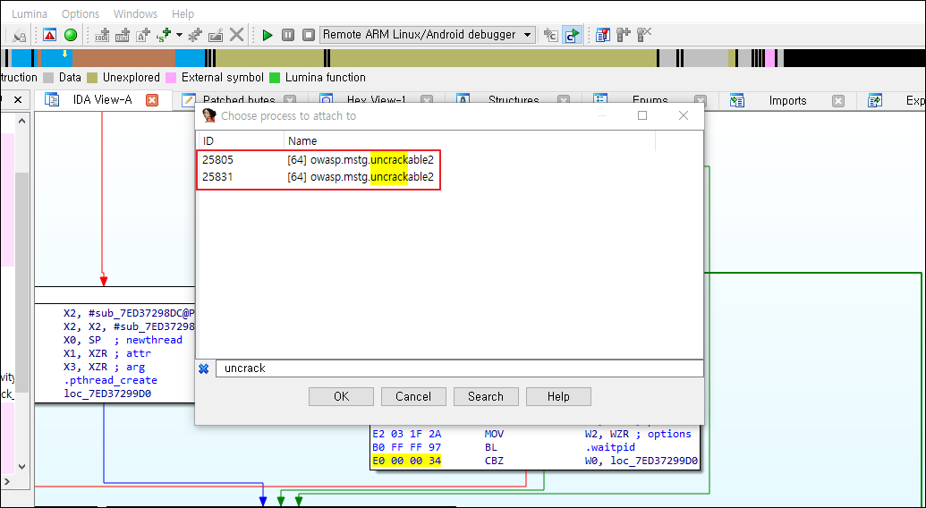 앱 재설치 후 breakpoint 설정 후 IDA로 동적디버깅 시도시 프로세스는 하나만 있는것 확인가능하며, attach 가능.