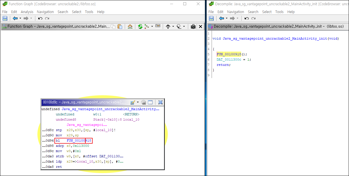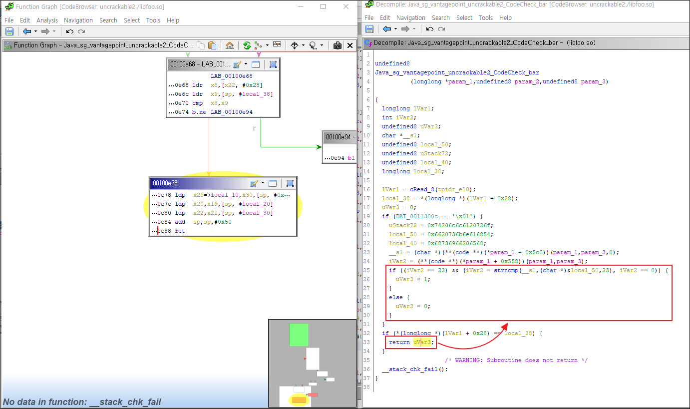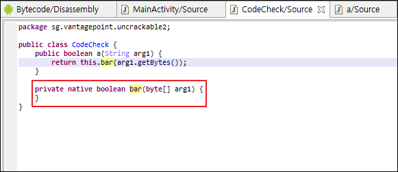 IDA로 "libfoo.so" 파일을 열고, hex-rays plugin으로 Java_sg_vantagepoint_uncrackable2_CodeCheck_bar의 코드를 복원하여도 보기가 까다로움.