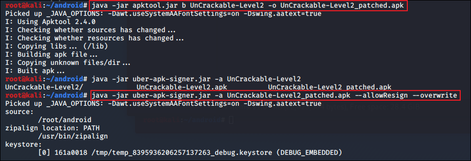 패치된 libfoo.so를 포함하여 apk파일 리패키징 및 사이닝