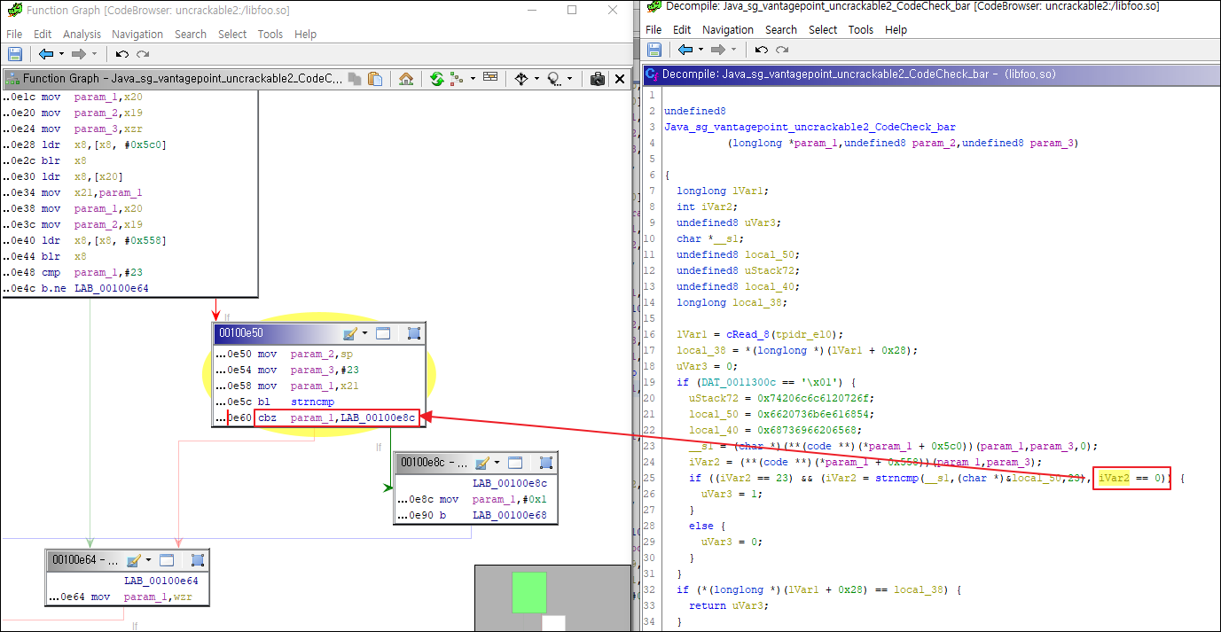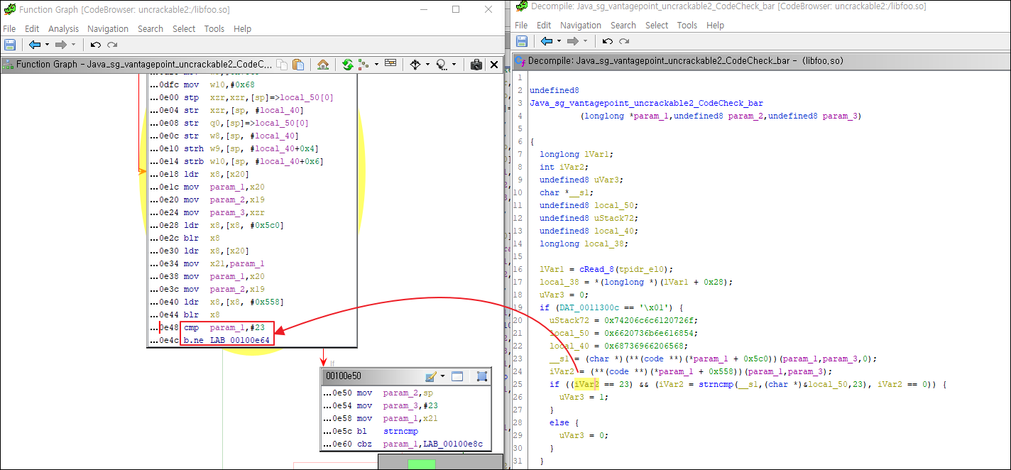 b.ne LAB_00100e64 ; flag값이 0이 아닌 경우 LAB_00100e64로 분기. 따라서 param1 의 값이 23이어야 LAB_00100e8c로 분기하며 strncmp함수를 실행함