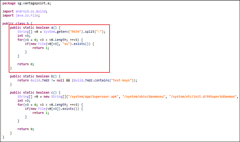 JEB로 디컴파일하여 루팅 체크로직 파악.