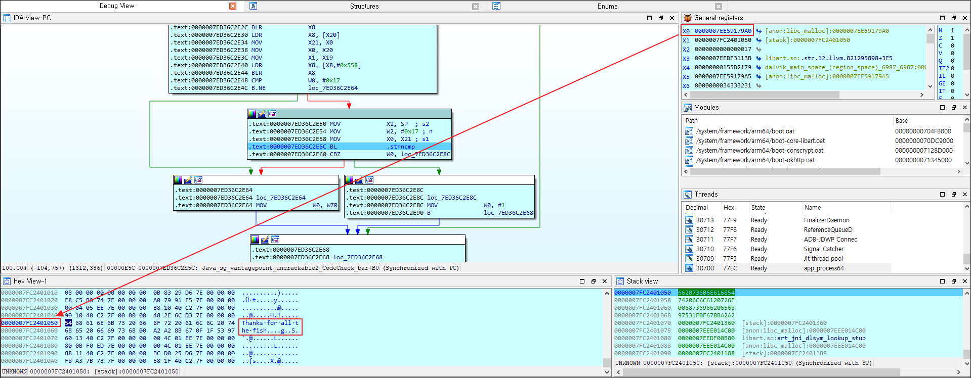 x0 레지스터에 내가 입력한 값인 "12345"가 들어가 있고, x1레지스터가 가르키는 주소에 가보면 비교하고자 하는 문자열인 "Thanks for all the fish"가 있음을 확인.(HEX View에서의 주소이동 단축키 G)
