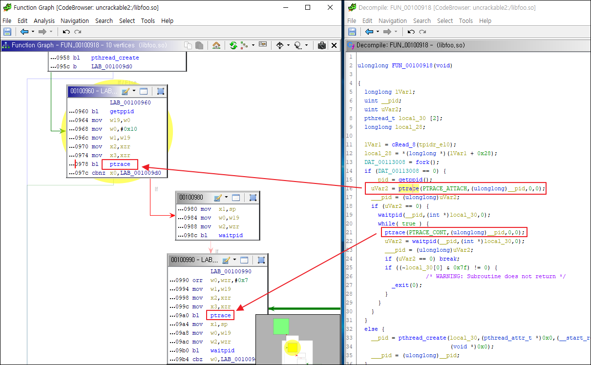 Java_sg_vantagepoint_uncrackable2_MainActivity_init 함수에서 사용자 함수 FUN_00100918로 분기하고 있으며, 따라 들어가면 ptrace 호출 로직을 확인할수 있음