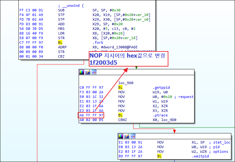 이 부분의 지시어를 nop 지시어로 변경 및 바이너리 패치하여 ptrace 호출이 일어나지 않도록 함.