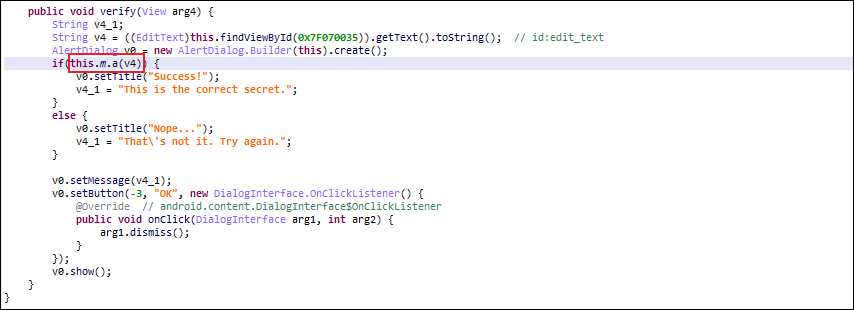 verify 메서드에서는 입력한 secret이 맞는지를 검사하는데, 이는 this.m.a(v4)를 따라 들어가면,