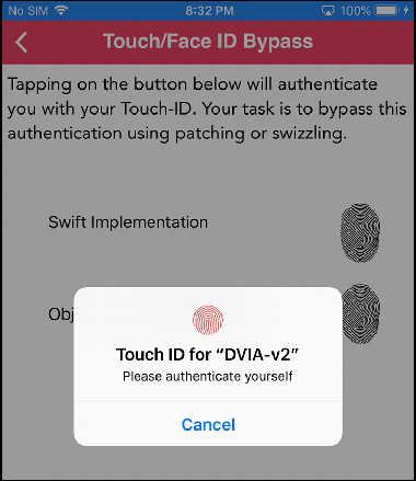 Swift Implementation 터치시 -[DVIA_v2.TouchIDDetailsViewController touchIDTapped:] 함수 호출이 일어남