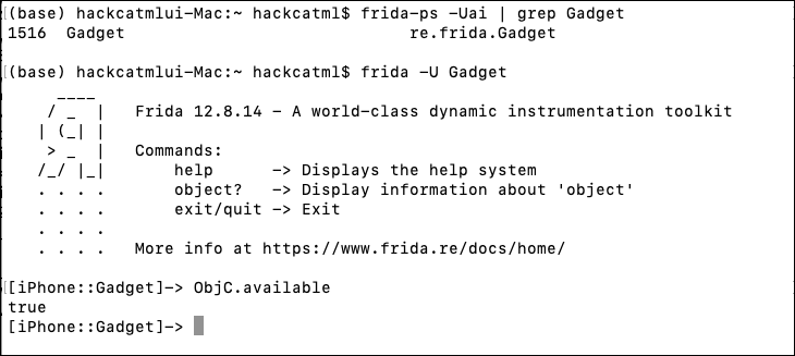 objection patchipa --source <decrypted ipa> --codesign-signature <서명 identity> --gadget-version <삽입할 frida-gadget 버전> // FridaGadget.dylib 삽입하는 patching 작업을 objection에서 자동으로 수행해줌. 수행결과 현재 디렉터리에 something-frida-codesigned.ipa 파일 생성.