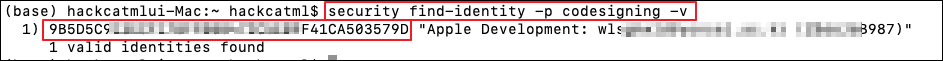 security find-identity -p codesigning -v // 서명 identity값 확인