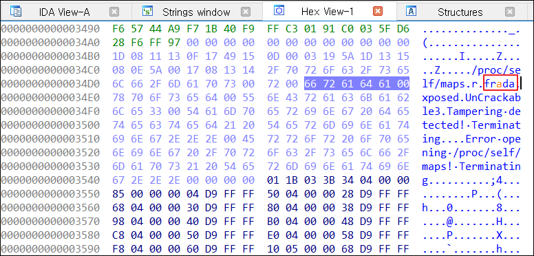frida 탐지 못하도록 "frida" 문자열 "frada"로 패치.