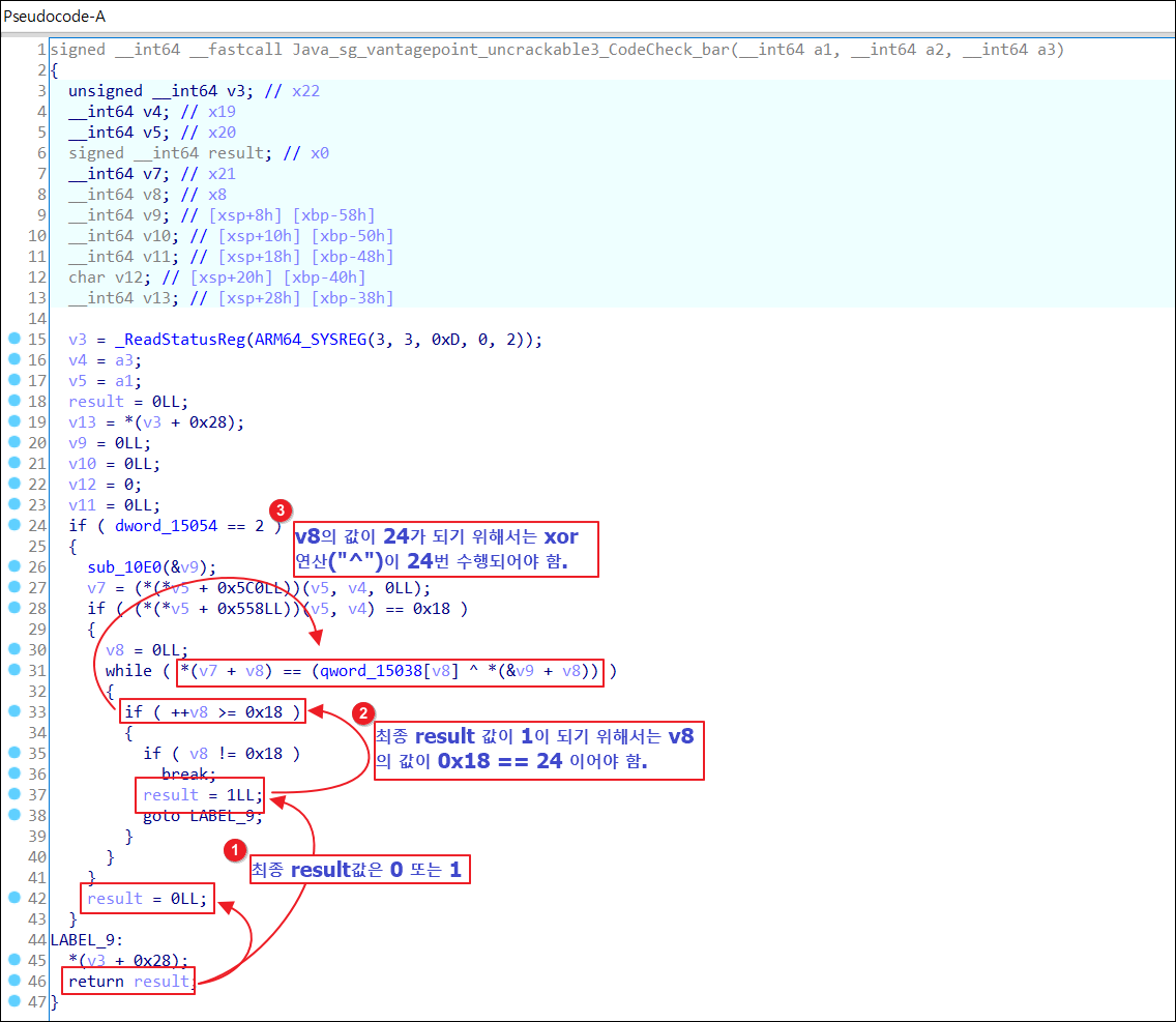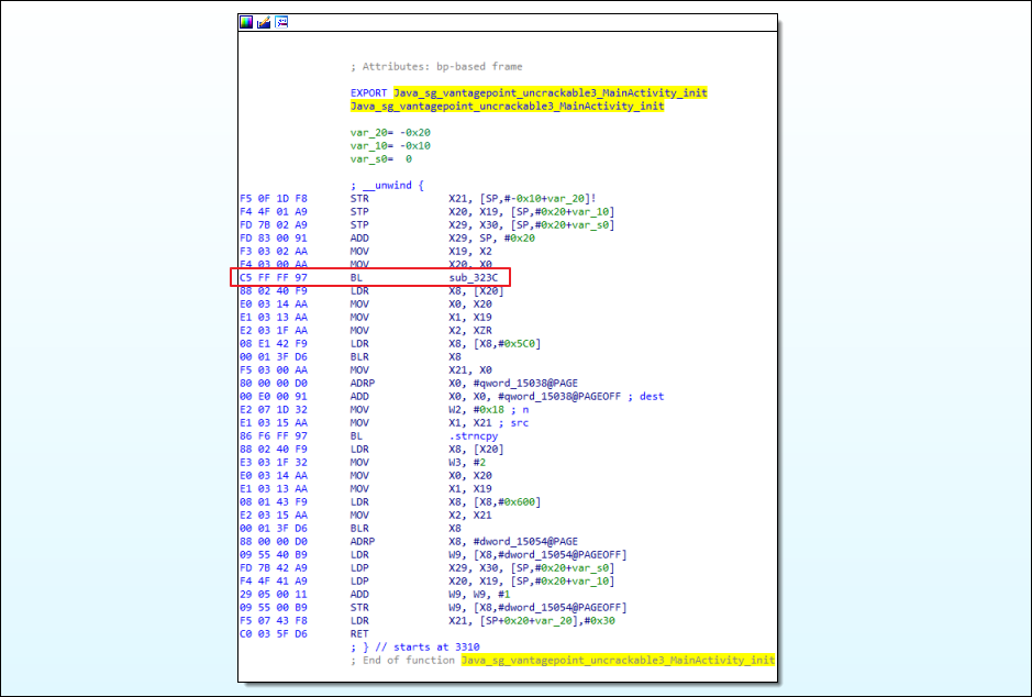"sub_323C"함수는 "Java_sg_vantagepoint_uncrackable3_MainActivity_init" 에서 호출되고 있음.