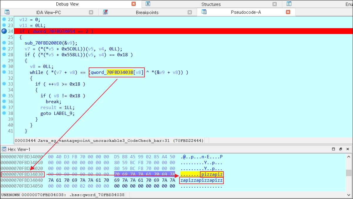 qword_70FBD34038에는 "pizzapizzapizzapizzapizz" 총 24자의 문자열이 들어있는 것 확인.