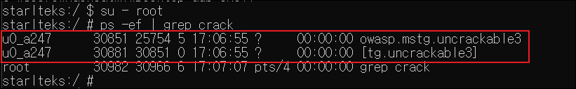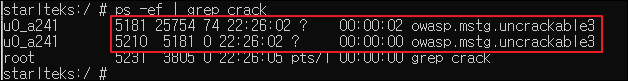 앱 실행 후 ps -ef 로 확인 시 프로세스 두개 생성되어 있음. --> ptrace(PTRACE_ATTACH, ...) 의심.
