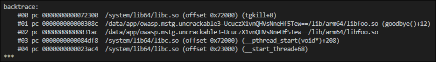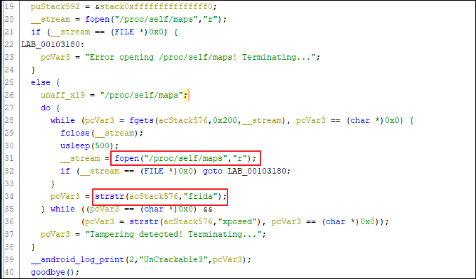 따라서, "libfoo.so" 파일이 로드되면 별도의 쓰레드에서 프리다 탐지 함수가 돌고 있겠거니 생각할 수 있고, "frida"나 "xposed"가 /proc/self/maps 에서 발견되면 goodbye() 함수를 호출하고 종료.