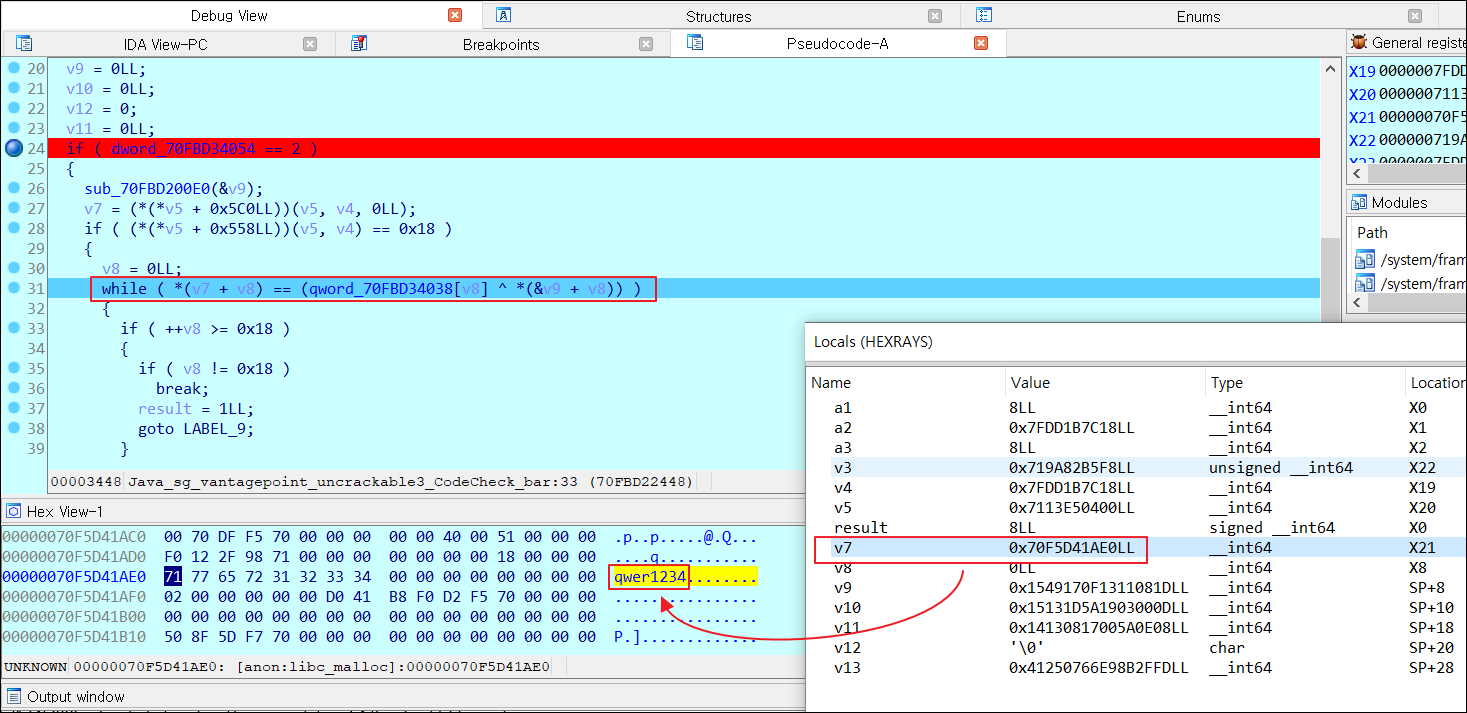 IDA에서 break 포인트 세팅하고, 단말기에서 "qwer1234" 입력하여 동적 디버깅 수행.