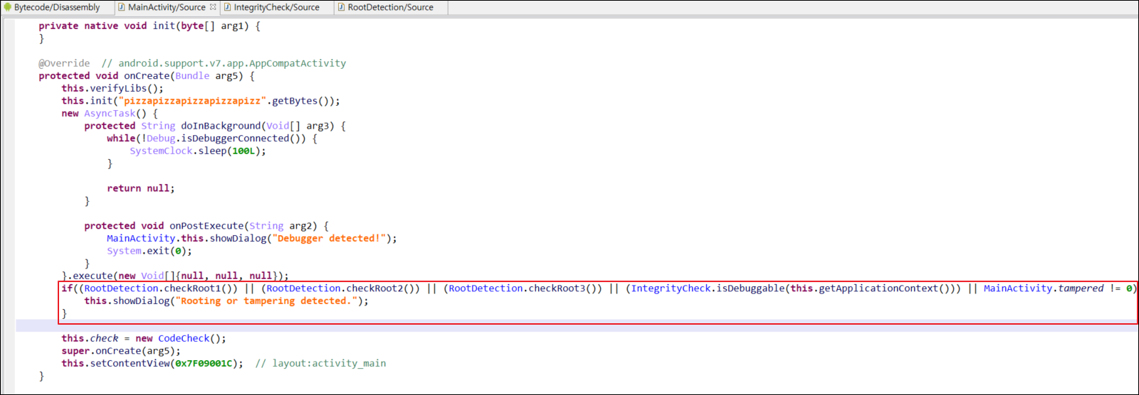 MainActivity에서 루팅 및 위변조(무결성) 검사를 하고 있음.