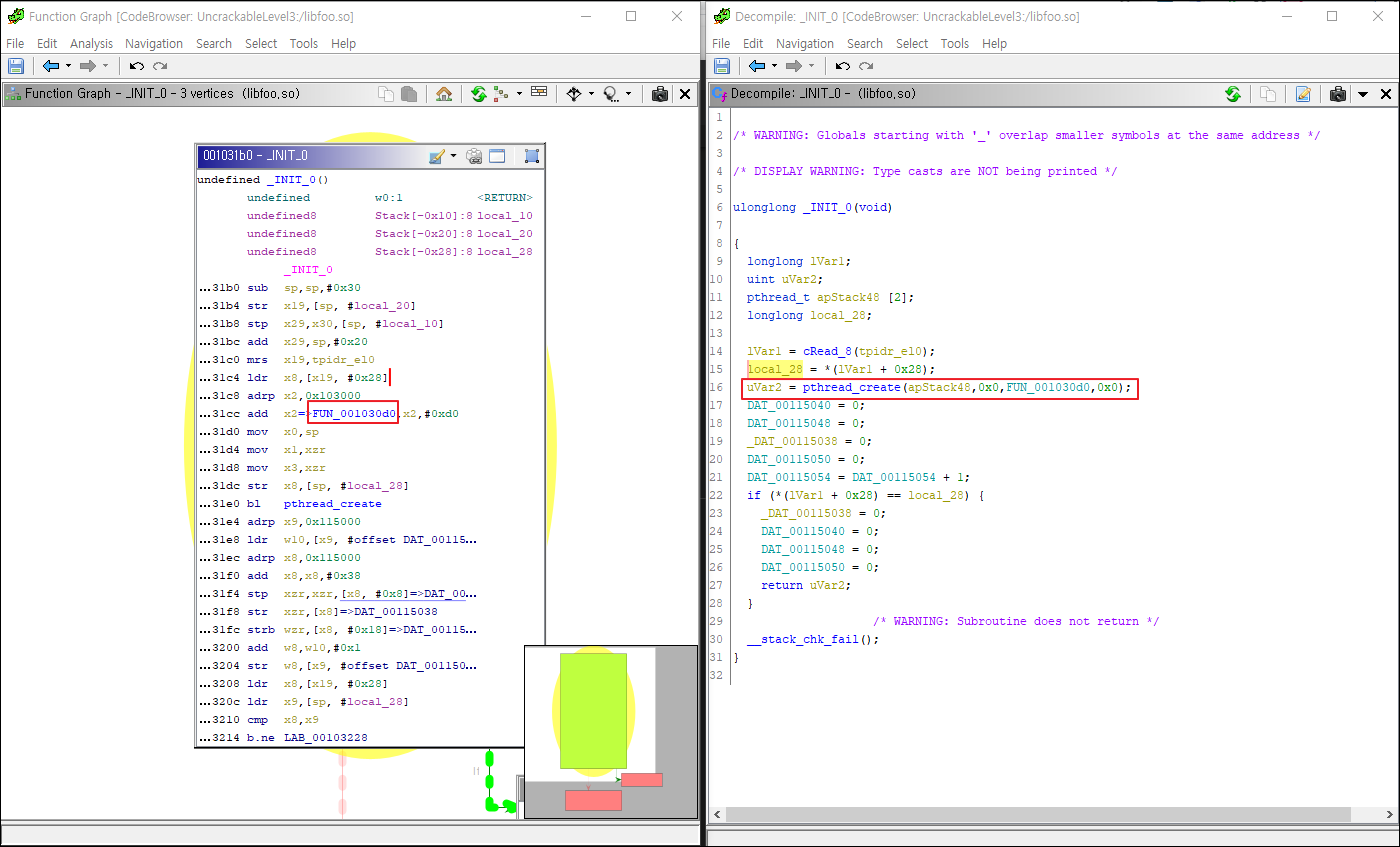 frida 탐지코드는 "FUN_001030d0()" 함수에 정의되어 있는데, 호출관계를 역추적해보면, "_INIT_0()" 함수에서 호출하고 있음을 확인 가능.