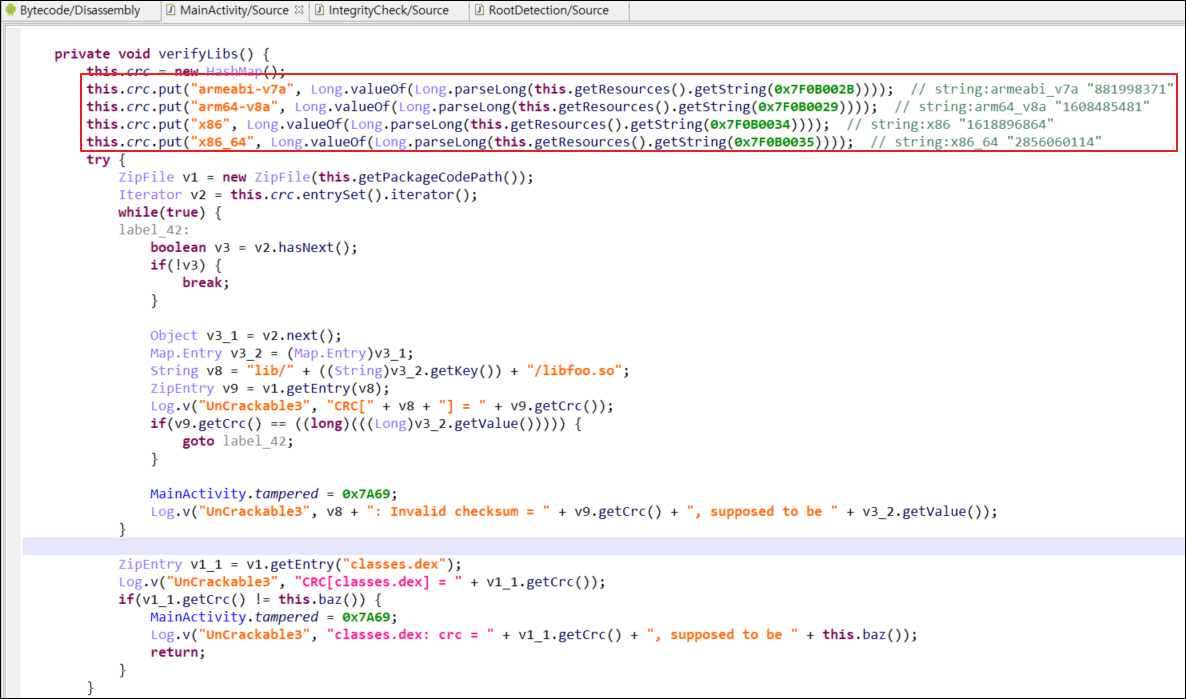 frida 탐지 및 ptrace를 우회하기 위해 so파일을 변조한 결과 .so파일의 무결성이 깨졌으므로 verifyLibs() 함수를 우회해야함.