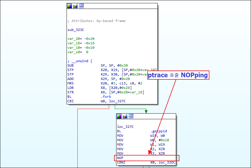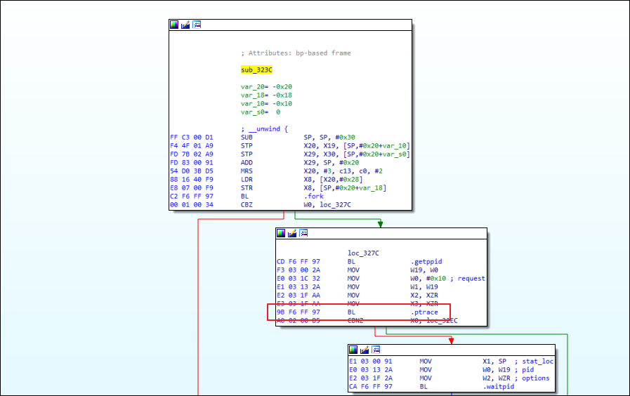 ptrace함수를 IDA에서 검색해보면 "sub_323C"에서 사용되어지고 있음