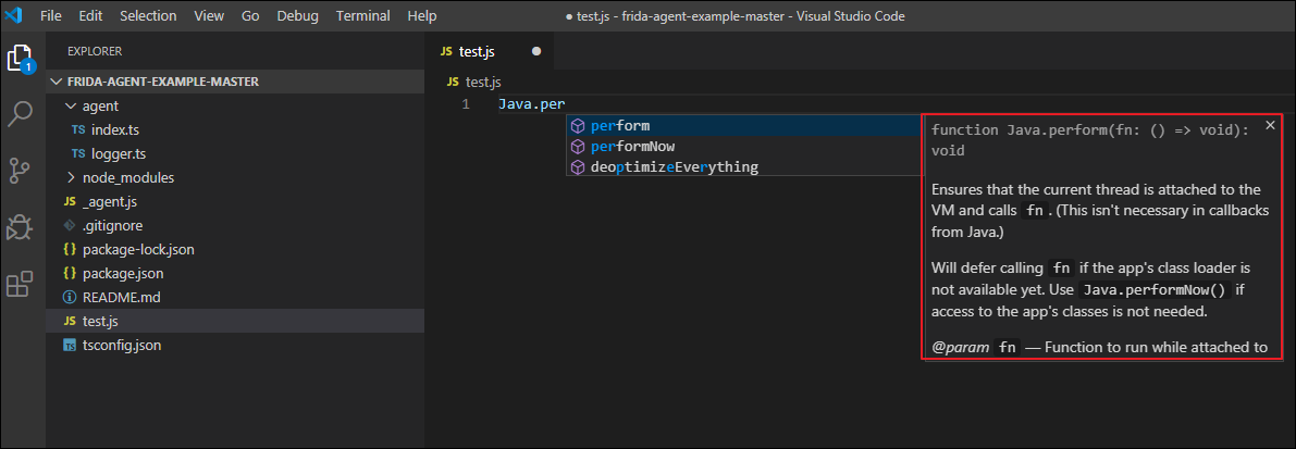 이제 해당폴더에서 작성하는 frida script는 code 도움말을 볼 수 있으며, 문법 오류 발생 시 빨간 줄로 표시가 됨.
