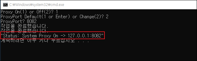 127.0.0.1:8082 으로 시스템 프록시 설정 완료.