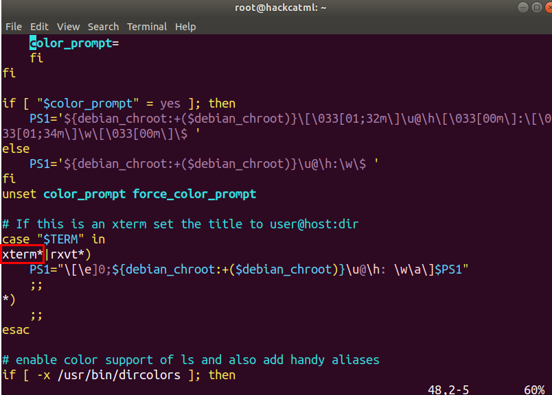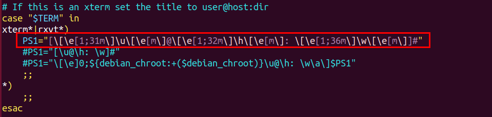 Prompt 변경은 환경변수 PS1을 바꿔줘야 합니다. vi ~/.bashrc 에서 바꿀 수 있습니다. 쭉 보다보면 다음과 같은 항목들이 보입니다. PS1이 세개나 되네요. 그런데 위에서 확인했던 터미널 종류가 xterm이므로 세번째 PS1만 바꿔주면 되겠습니다.