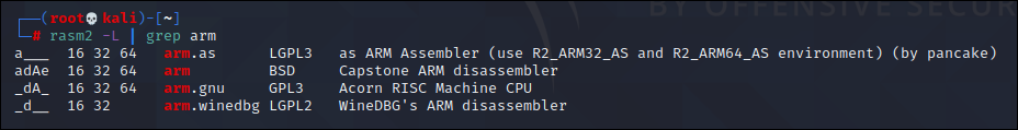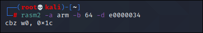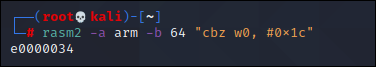 rasm2 -a arm -b 64 "cbz w0, #0x1c" // -a: architecture, -b: bits
