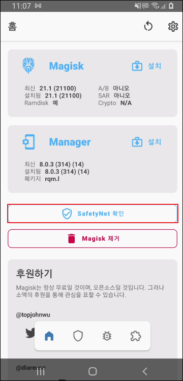 SafetyNet 우회 여부는 Magisk의 "SafetyNet 확인"에서 확인 할 수 있습니다.