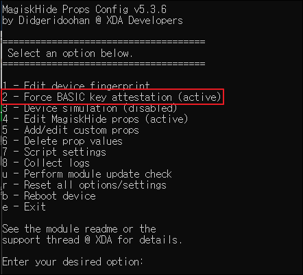 Fail이 뜬다면 "MagiskHide Props Config" 모듈로 "Force BASIC key attestation"의 값을 변경합니다.