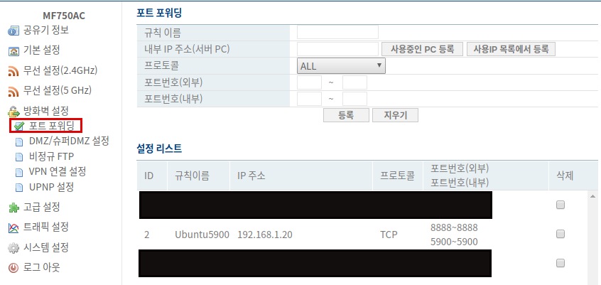 원격으로 접속하려면 포트포워딩 설정을 해놔야겠죠? 공유기 관리자 페이지에 들어갑니다. 저는 공유기 공인 IP:8888 -> 우분투IP:5900 으로 포워딩 되게 설정해놨습니다.