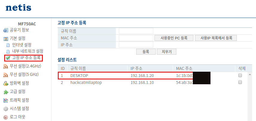 이제 공유기의 관리자 페이지로 접속하여 wol을 설정해줍니다. wol을 이용하려면 우분투의 IP가 일정해야 하므로, 고정 IP를 등록해줍니다. 다음으로 wol설정에서 규칙이름과 네트워크 카드의 mac 주소를 등록해주면 끝입니다.