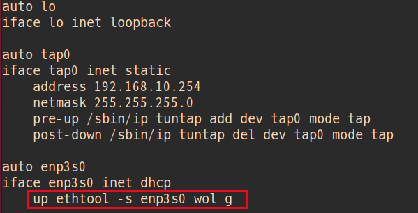 만약 Wake-on 항목이 'g'가 아닌 경우, ethtool -s <인터페이스 이름> wol g 명령어로 활성화 시켜 줍니다. 이제 컴퓨터가 꺼져도 랜카드는 매직패킷에 대해 대기상태가 됩니다. 그러나, 매번 명령어를 치면 번거로우니 부팅 시마다 자동으로 실행되도록 vi /etc/network/interfaces 로 열어서 up ethtool -s <인터페이스 이름> wol g 를 추가해줍니다.