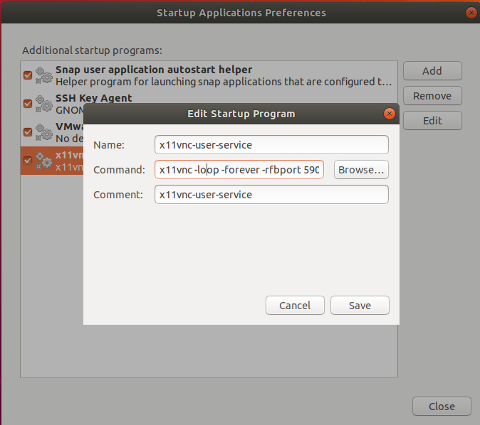 Startup applicaiton을 실행시켜서 Add버튼을 눌러 Startup Program을 등록해줍니다. name과 comment는 아무거나 써주고, command 란에 x11vnc -loop -forever -rfbport 5901 -rfbauth /etc/x11vnc.pass 입력 후 저장합니다. 포트번호는 gdm 계정이 사용했던 5900과 달라야 합니다.