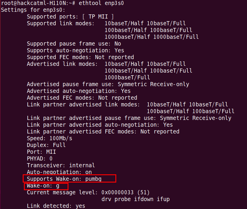 설치 후 ethtool <인터페이스 이름> 을 입력하여 wol이 지원되는지, 지원된다면 활성화 되어 있는지 여부를 확인합니다. Supports Wake-on 항목은 NIC카드가 WOL을 지원하는지 여부에 대한 것으로 반드시 d가 아니어야 합니다. Wake-on 항목은 WOL의 활성화 여부를 나타내는 것으로 'g'이면 활성화된 상태입니다.
