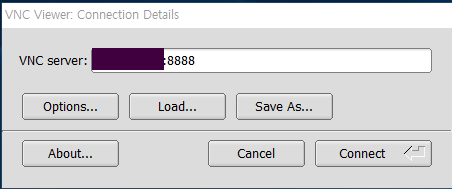 Address란에는 포트포워딩 해줬던 공유기공인 IP:외부포트 를 적어주면 됩니다. 저의 경우에는 로그인 절차를 담당하는 5900번 포트는 공유기 공인IP:8888, 로그인 후의 xVNC서비스 접속용 포트 5901번 포트는 공유기 공인IP:8889로 등록했습니다.
